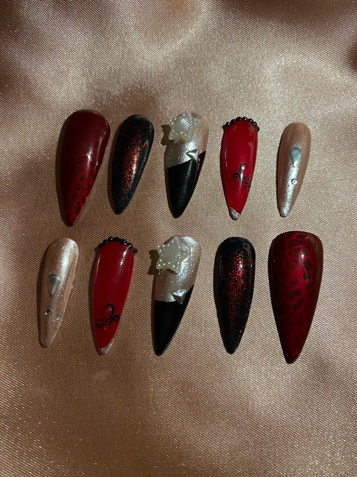 ✨ Ürün Detayları: • Tasarım: Siyah ve kırmızının büyüleyici uyumu, 3D yıldız aksesuarları, metalik detaylar ve özel dokulu desenlerle zenginleştirildi. • Kalite: Yüksek kaliteli malzemeler ve profesyonel nail art teknikleri ile hazırlandı. Soyulma yapmaz, uzun ömürlüdür. • Tekrar Kullanılabilirlik: Doğru uygulama ve çıkarma işlemiyle seti defalarca kullanabilirsin. • Form: Görseldeki tırnak Stiletto formundadır. M bedendir