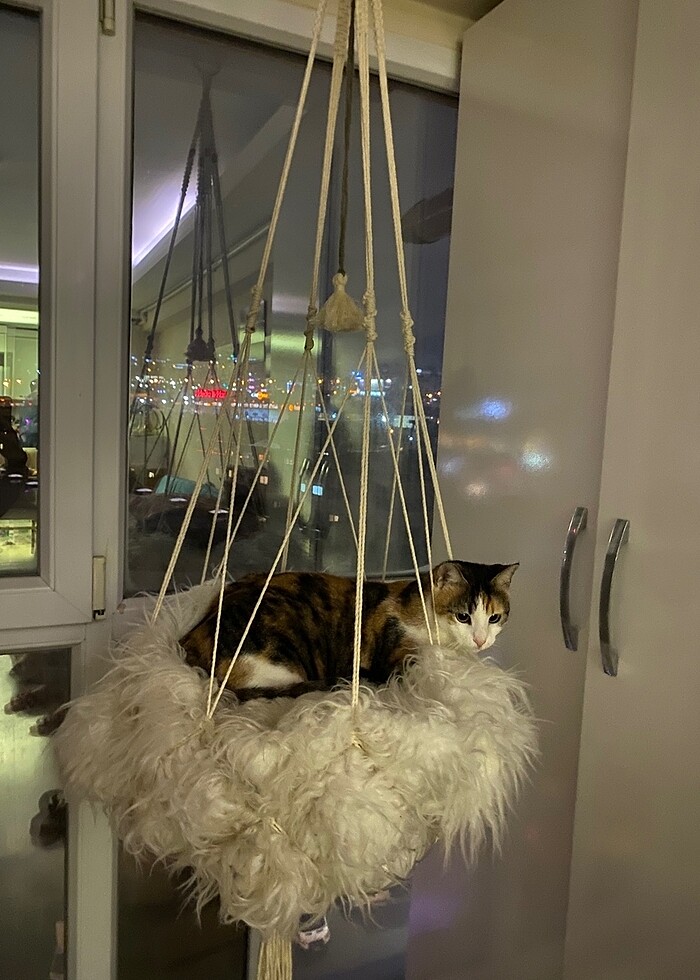 Makrome el yapımı kedi yatağı. İstediğiniz renkler, boyutlar ve modelleri yapabilirim. Bu fiyat bu modelle aittir. Başka modeller için fiyat sorun. Satın almadan önce yorum yaparak yeni ilan açtırın lütfen. Bu modelin uzunluğu: 170cm 7-8 kilolu can dostlarımız için uygun yataklar yastıksız göndermektedir.✅