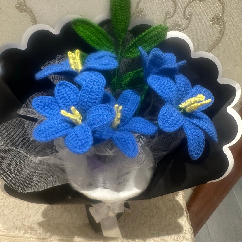Bohem tarzda, beyaz tül ile sarılmış, yeşil yapraklı mavi el örgüsü çiçek buketi.