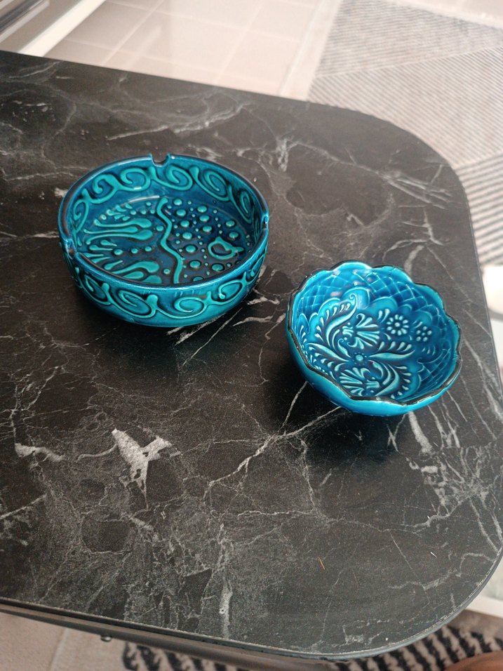 İki adet el yapımı, canlı mavi renkte ve geleneksel desenlerle süslenmiş seramik kase seti. Hem dekoratif hem kullanışlıdır.