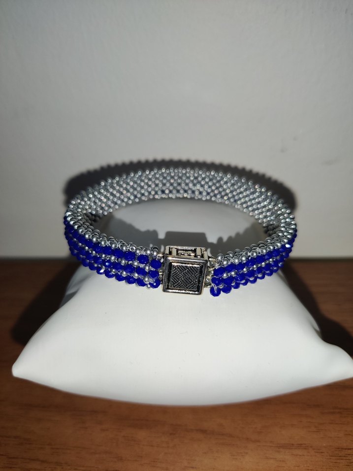 Mavi ve gri boncuklardan oluşan, kare tokalı çağdaş kadın bilekliği, günlük kullanıma uygundur.