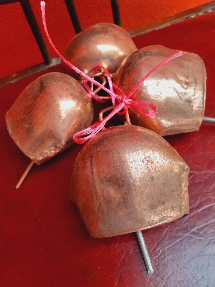 Pembe iplerle bağlanmış, el yapımı metal zil seti. Rustik ve aşınmış görünüme sahip. Dekoratif veya kültürel kullanım için uygun. Metal zil adet fiyati 90 tl