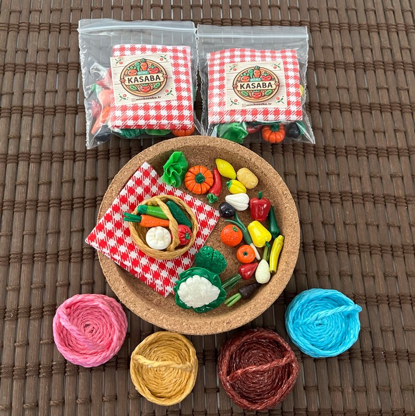 Pembe sepetli minyatür mini boy meyve sebze seti 27 parça. Dörtlü ana yemek tabağı