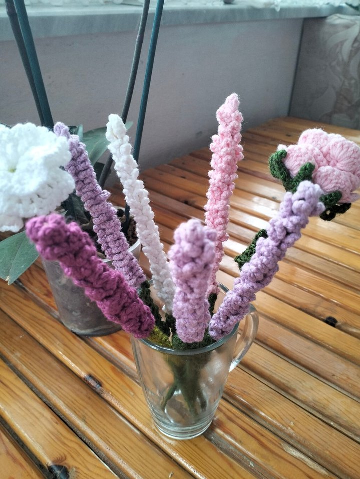 Pastel mor tonlarda el yapımı örgü çiçekler, cam vazoda zarif bir dekorasyon sağlar.