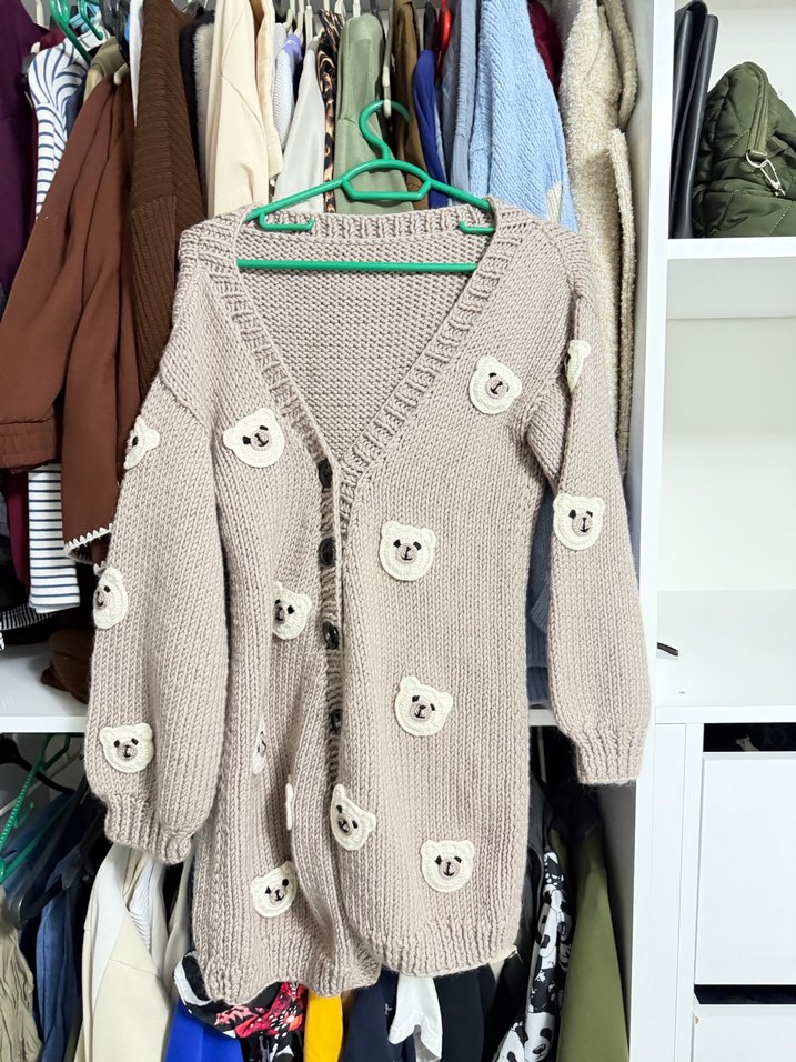 Bej renkte, nakışlı ayıcık desenli uzun kollu, V yaka, bol kesim triko hırka. Rahat ve sıcak bir görünüm sunar.