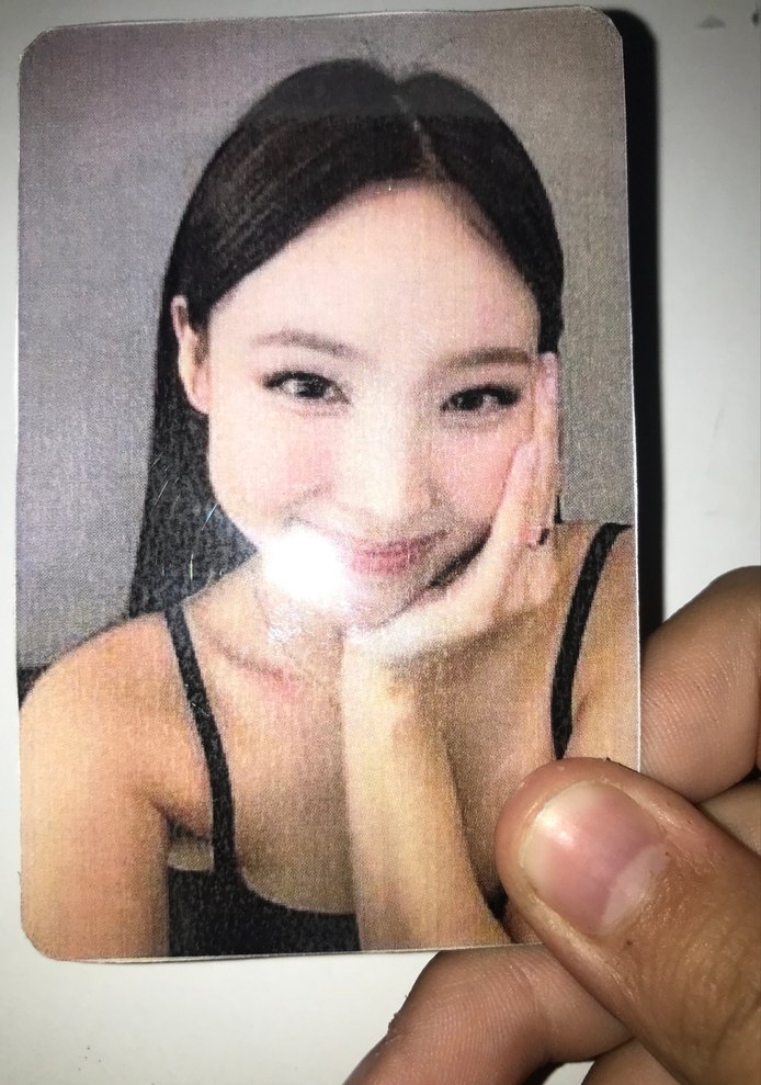 Uzun koyu saçlı, siyah üst giymiş gülen bir kadının fotoğraf kartı, parmaklar arasında tutuluyor. Kişisel veya koleksiyonluk bir ürün gibi görünüyor.
