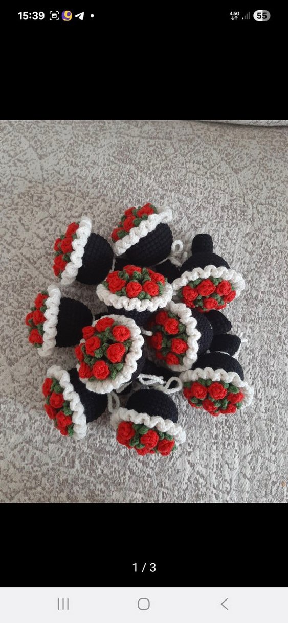 Siyah taban üzerine beyaz kenarlıklı kırmızı güllerle el yapımı amigurumi anahtarlık