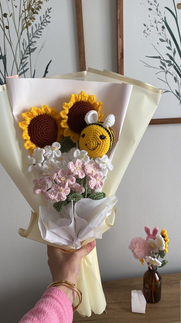 Bohem tarzda, el yapımı örgü ayçiçeği, güler yüzlü arı ve narin pembe-beyaz çiçeklerden oluşan krem kağıda sarılı buket.
