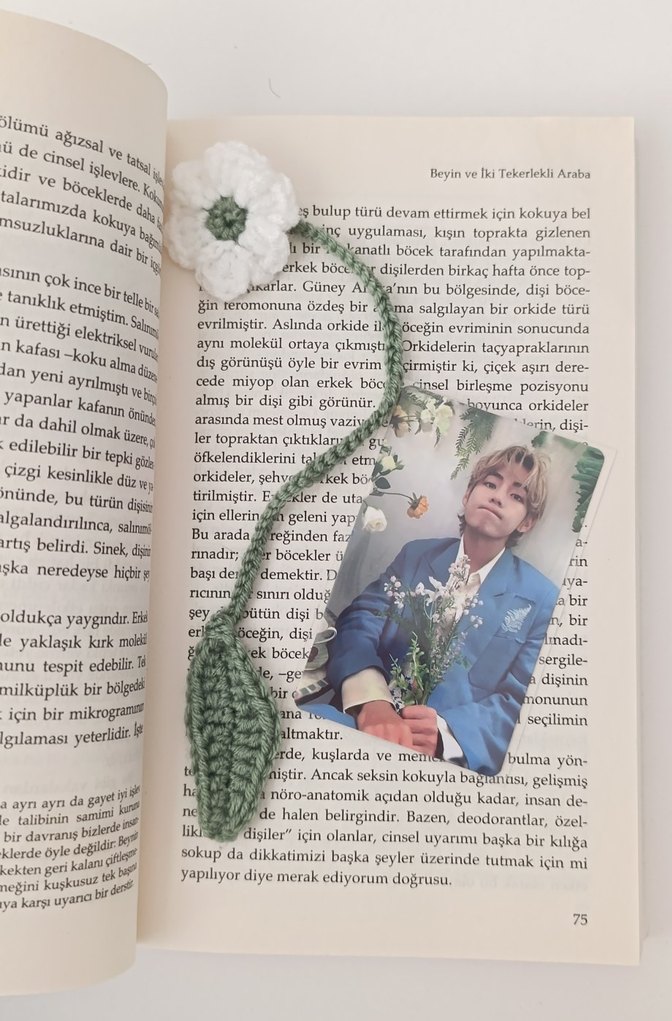 Yeşil saplı, el yapımı beyaz örgü çiçek kitap ayracı, hikaye kitaplarınız için sayfa işaretleyici olarak kullanılır. kitap ve pc dahil değildir