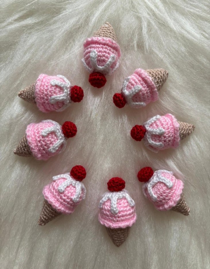 en az alım 10 adettir Pembe ve kırmızı kiraz detaylı el yapımı örgü dondurma süsleri, bohem tarz dekor için uygun. adet fiyatıdır istenilen renk ve adette hazırlanır dilerseniz anahtarlık olarak dilerseniz kiyafetlerinizde süs olarak veya magnet şeklinde tercih edebilirsiniz