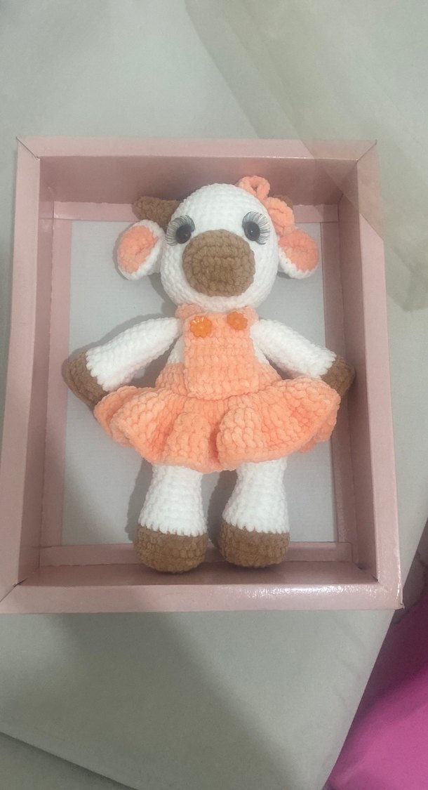 Pastel tonlarda, turuncu elbiseli, çiçek detaylı peluş oyuncak, deve tüyü ve beyaz renklerde.