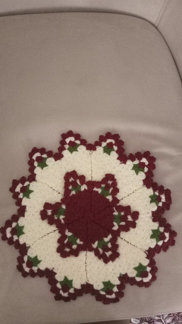 Bordo, beyaz ve yeşil renklerde çiçek desenli el yapımı örgü dekoratif supla. Yumuşak dokulu ve geleneksel tasarım.