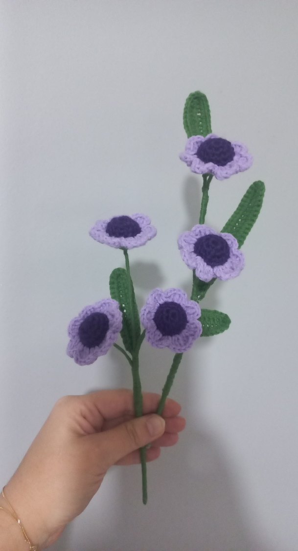Bohem tarzda, yeşil saplı ve yapraklı mor tonlarında el yapımı örgü çiçekler. Dekoratif kullanım için uygun .