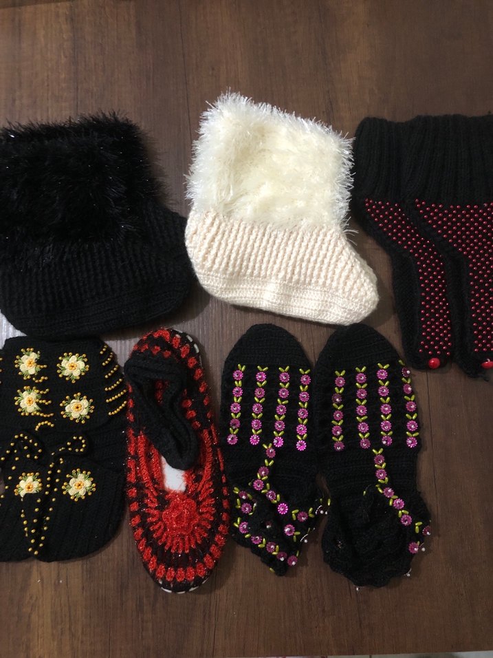 Dekoratif desenler ve yumuşak dokulara sahip el yapımı örgü patik ve çoraplar, çeşitli renk ve tasarımlarla. Adet fiyatı