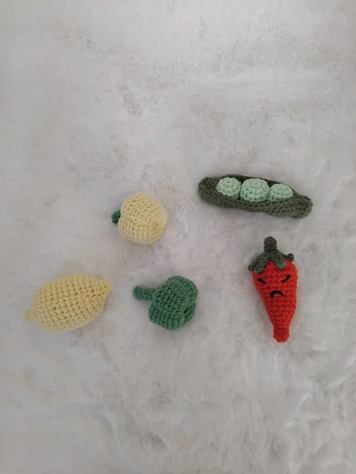 El yapımı örgü sebzelerden oluşan set: limon, acı biber, bezelye, yeşil biber ve küçük yuvarlak sebze. Dekorasyon veya oyun için uygundur.