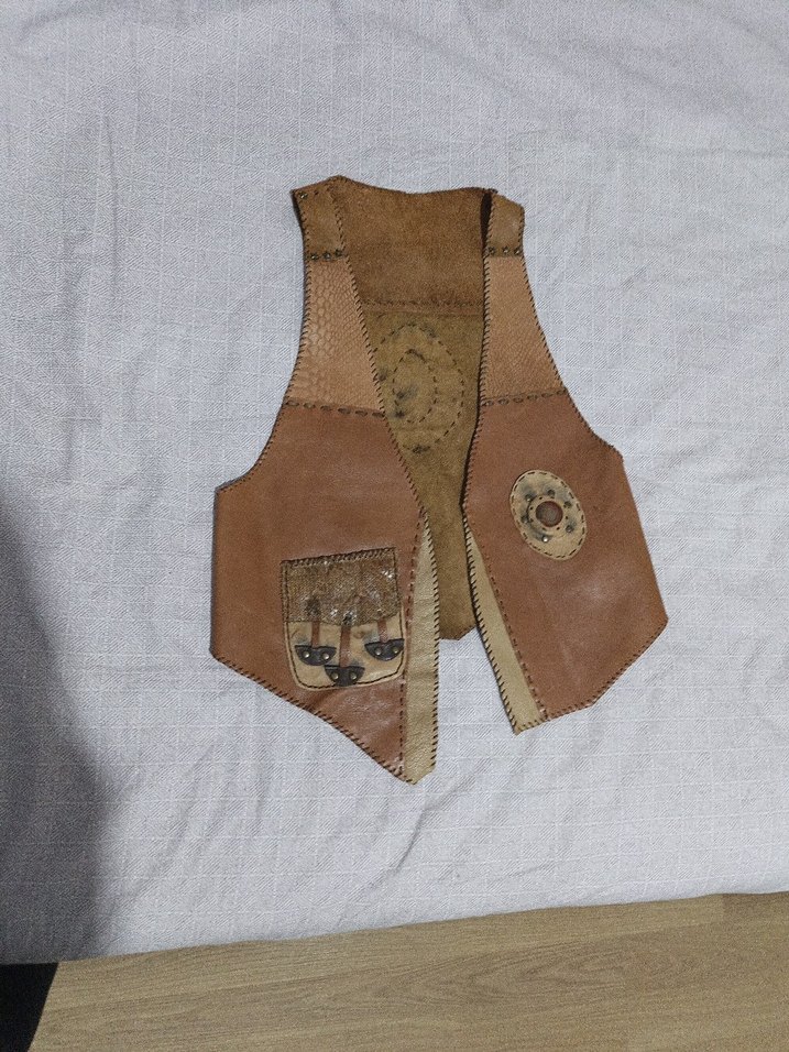 Nakış işlemeli, western deri kadın yeleği. Kolsuz ve çentikli yaka detaylı, bohem vintage tarzına uygun. tamami el yapimi. ustundeki tas gercektir. 36-40 beden araligi icin uygundur
