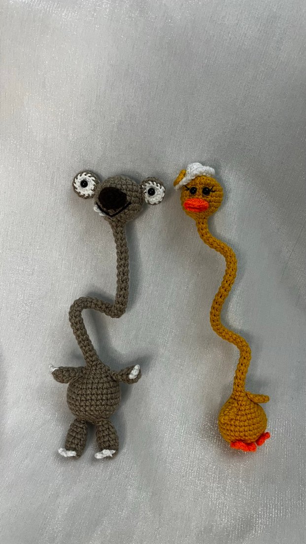 Gri ve sarı renklerde, esnek boyunlu ve detaylı yüz özelliklerine sahip el yapımı örme peluş oyuncaklar. Yumuşak ve eğlenceli tasarım.