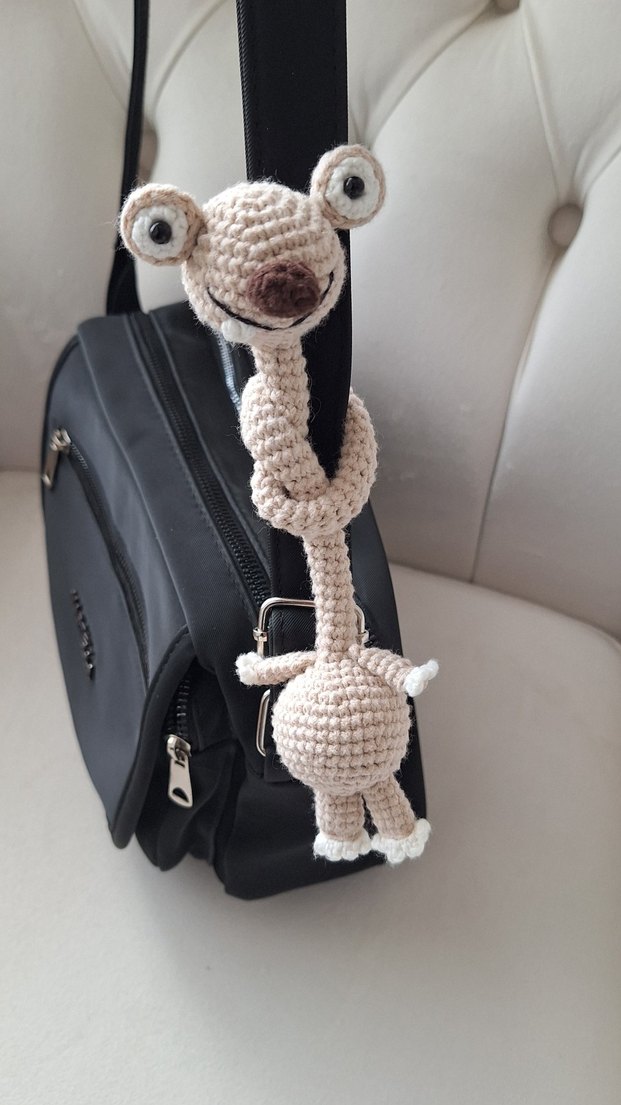 Camel ve gri renklerde el yapımı örme Buz Devri SİD oyuncak, gülümseyen yüz ve büyük gözlere sahip. Yumuşak ve hafif, anahtarlık direksiyon veya çanta süsü olarak kullanılabilir .