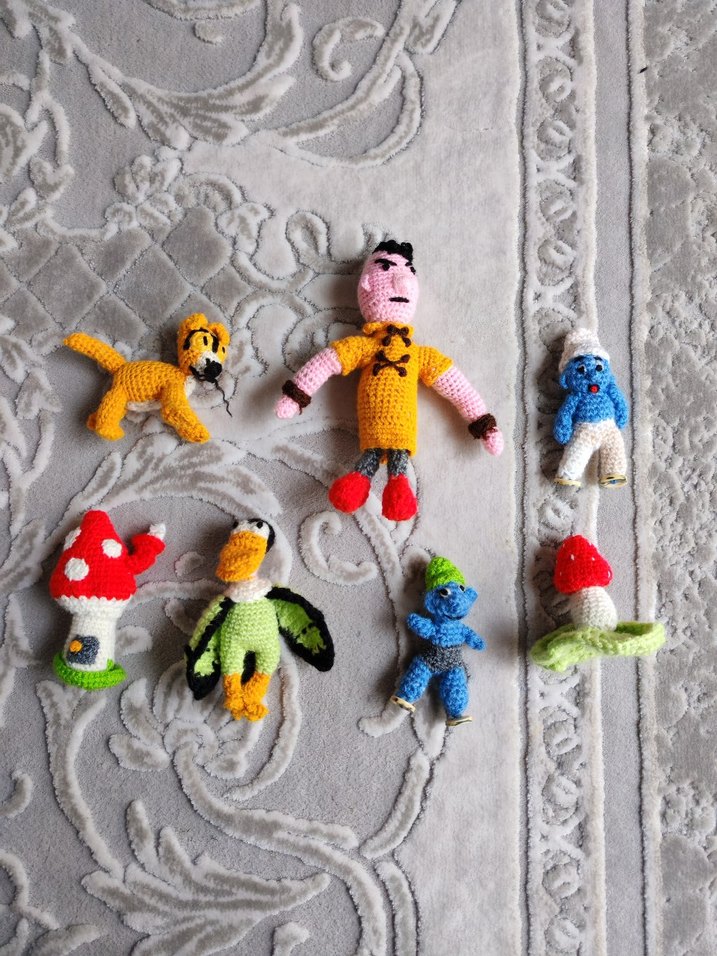 Renkli ipten el yapımı örgü oyuncaklar, karakterler ve mantar figürleri içerir. Yumuşak dokuda, canlı detaylara sahiptir.