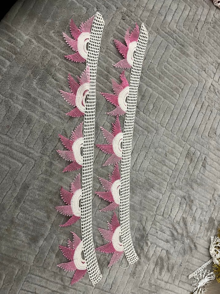 El yapımı pembe ve beyaz renklerde, detaylı çiçek desenli dantel şeritler, dekoratif kullanım için uygundur.