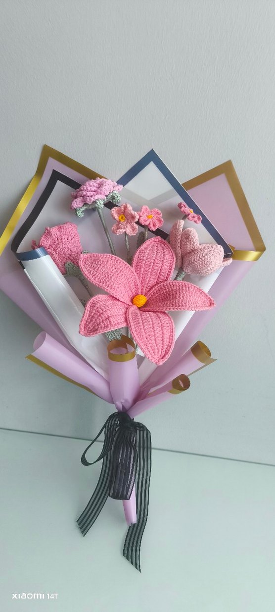 El yapımı pembe örgü çiçeklerden oluşan buket, dekoratif kağıt ve siyah kurdele ile sarılmış, bohem tarzda çeşitli çiçek modelleri içerir.