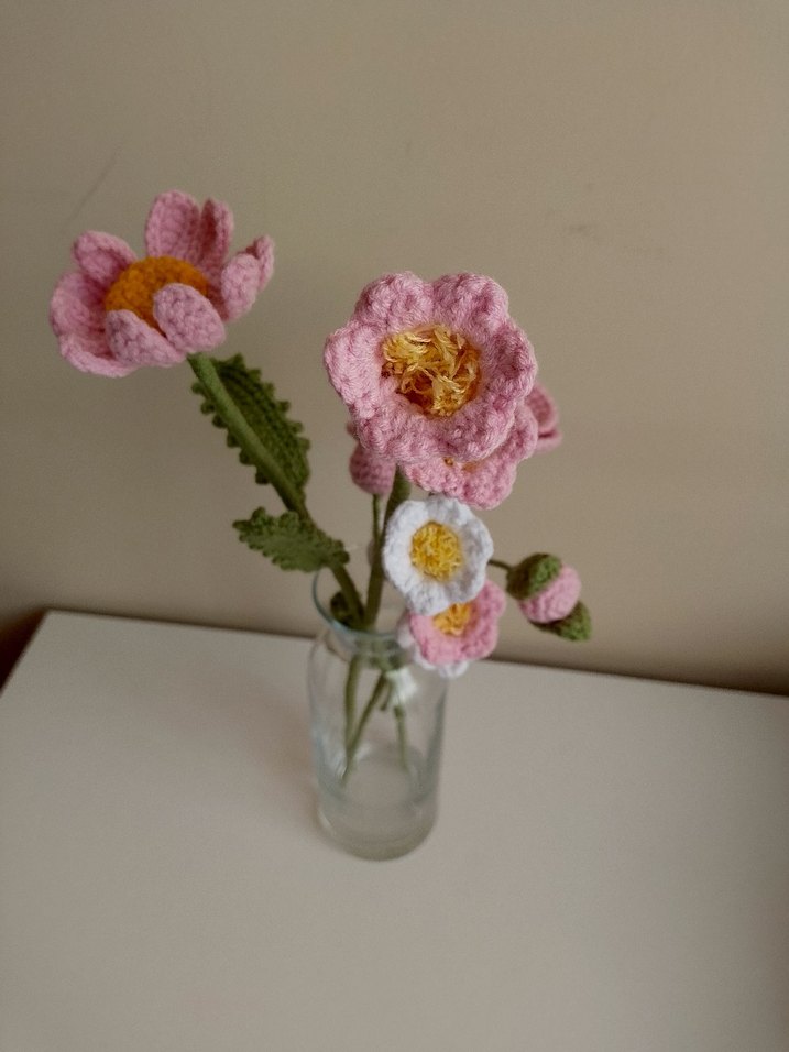 Pastel pembe ve beyaz tonlarda el yapımı örgü çiçeklerimiz buket şeklinde gönderilmekterir.