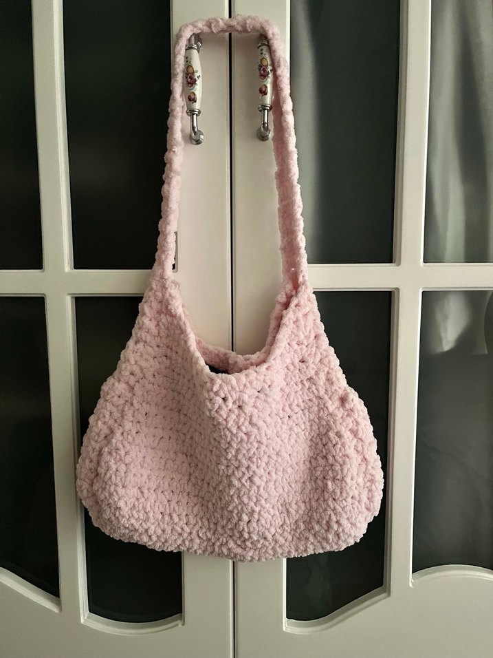 Pastel pembe renkli, örgü dokulu, rahat ve bohem tarzda kadın omuz çantasıdır. Yumuşak örgü kumaştan yapılmış ve desensizdir.