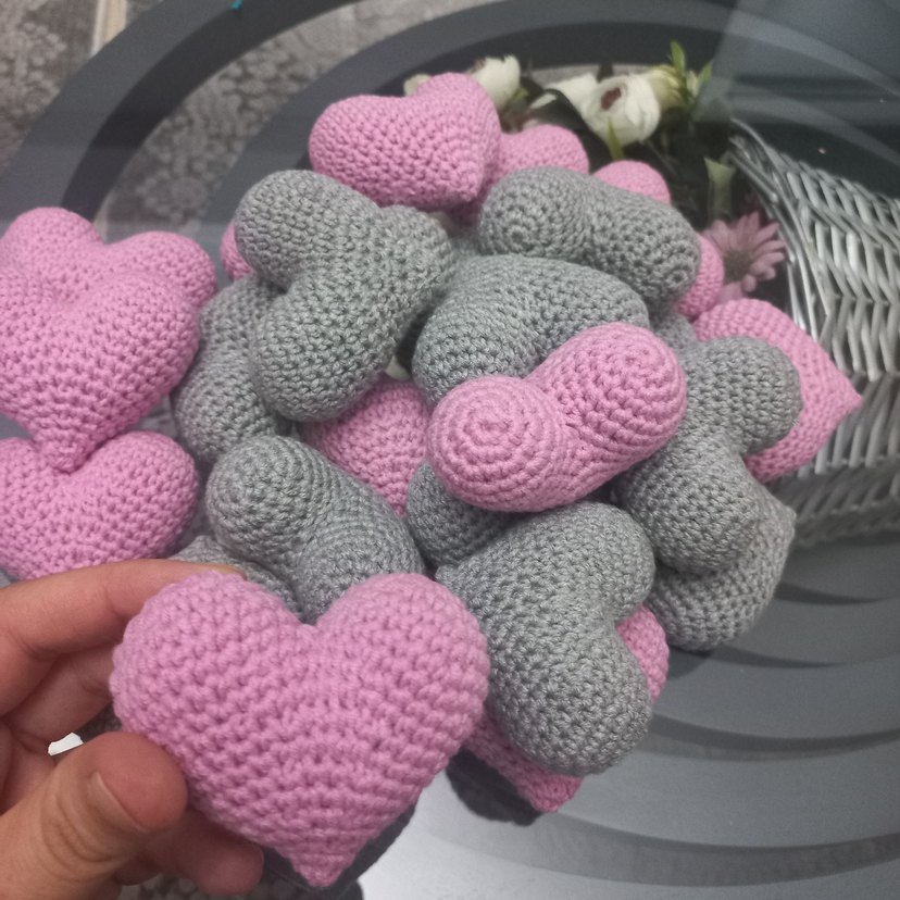 Yumuşak dokulu, el yapımı pembe ve gri örgü kalpler, dekorasyon veya hediye için uygun.