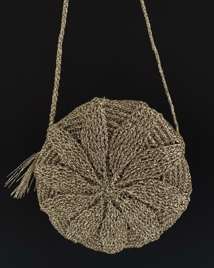 Bej renkli, el yapımı örgü hasır simli ipten yapılmış, püsküllü bohem tarzda yuvarlak çapraz çanta. Yumuşak dokulu kumaşıyla günlük kullanıma uygundur.
