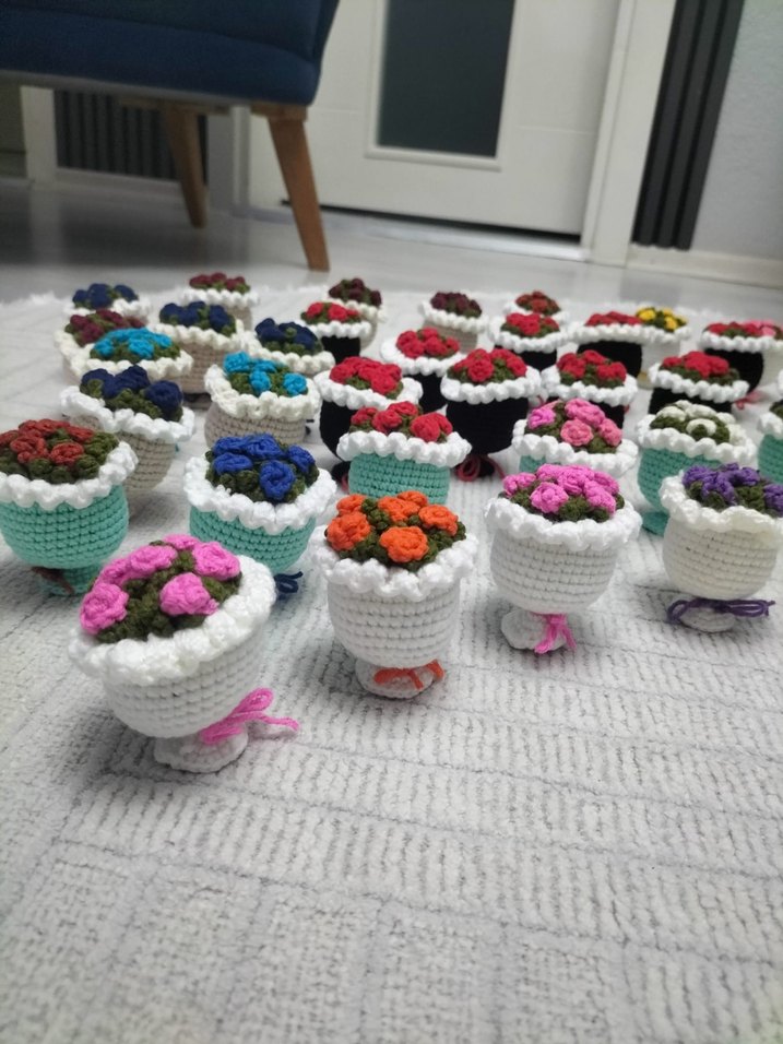 Renkli iplikten el yapımı bohem tarzda mini çiçekli saksılar, dekoratif kullanım için uygundur. Her saksı farklı renklerde canlı tığ işi çiçekler içerir.