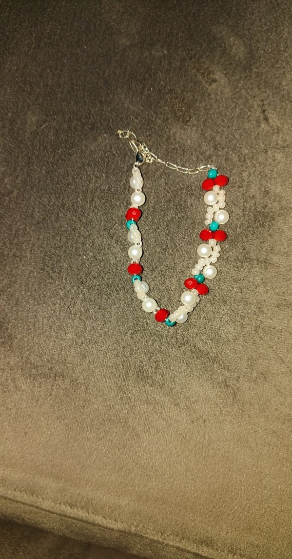 Kırmızı, turkuaz ve beyaz boncuklardan oluşan renkli, bohem tarzda kadın bileklik, günlük kullanıma uygundur.
