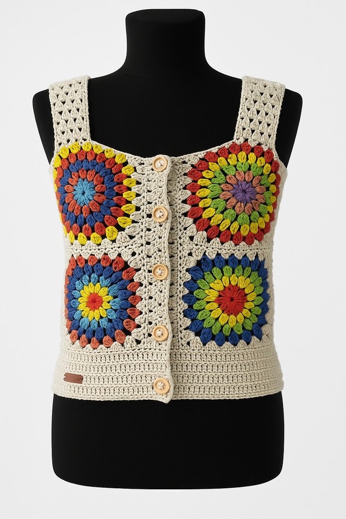 El Yapımı Renkli Örgü Bohem Kolsuz Mini Yelek