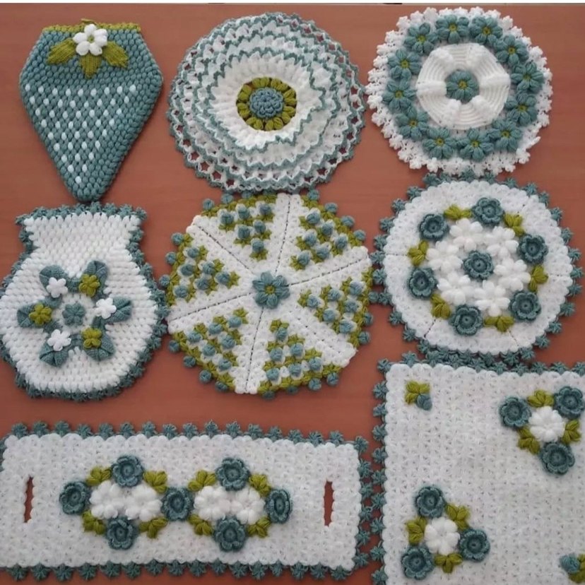 Pembe, beyaz ve yeşil renklerde el yapımı örgü motifler. Çiçek ve geometrik desenler içeren geleneksel el sanatları.