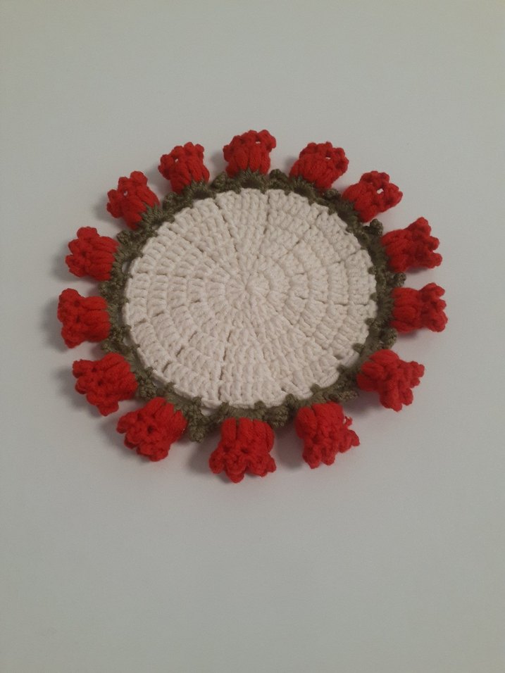 El yapımı örgü nihale, beyaz yuvarlak merkez, zeytin yeşili kenar ve çevresinde kırmızı çiçek detaylarıyla süslenmiştir.