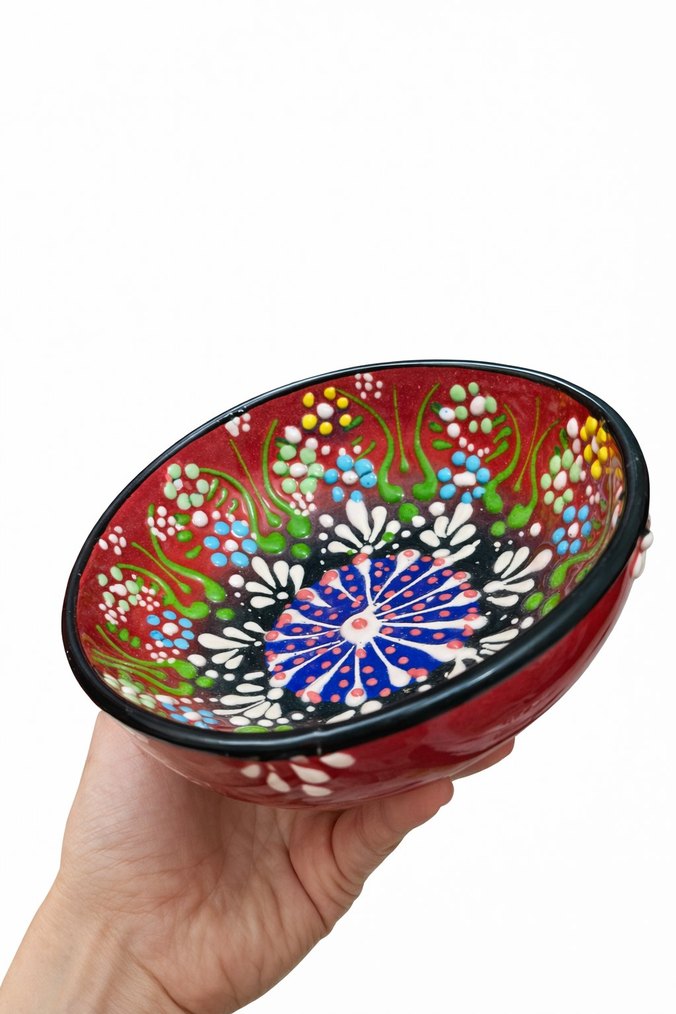 El yapımı seramik kase, kırmızı, mavi, beyaz ve yeşil renklerde canlı çiçek desenleriyle süslenmiştir.