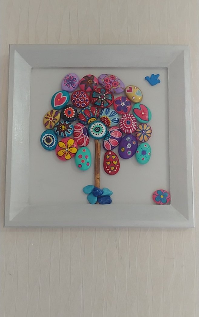 El yapımı beyaz çerçevede, çiçek ve kalp desenli boyalı taşlardan oluşan renkli tablo