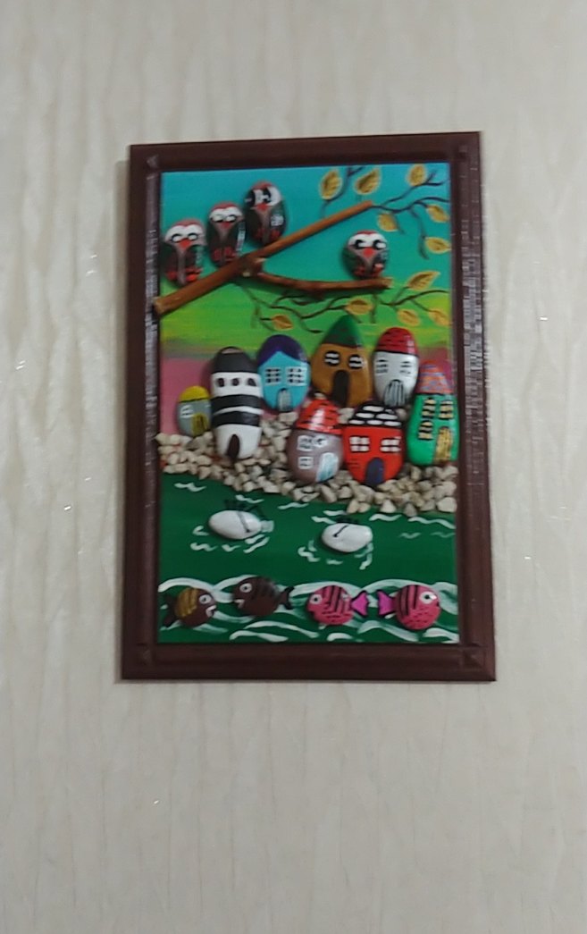 El yapımı renkli taşlardan yapılmış kuşlar, evler ve balıklar içeren canlı doğa temalı bir tablo, ahşap çerçeveli. 20×30cm.