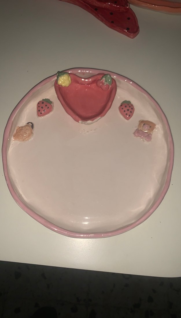 Pembe pastel renkte, kenarında meyve ve ayıcık figürleri bulunan, kalp şeklinde küçük kase içeren çocuk tabak seti.