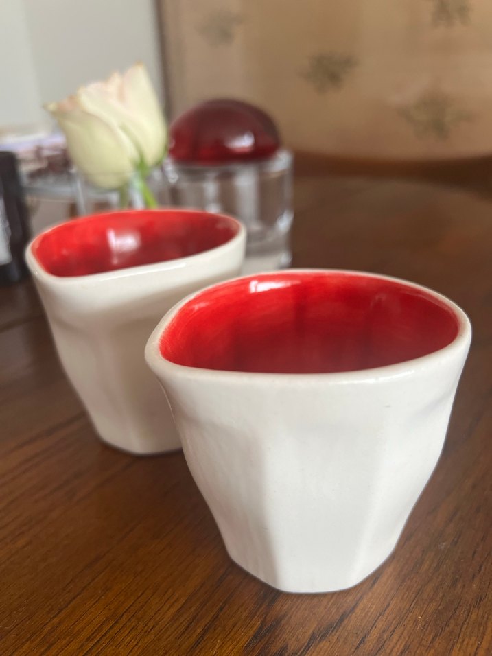 El Yapımı iki adet Seramik Kahve Bardağı. Bardakların dışı ekru rengi, içi çok tatlı canlı bir kırmızı. Modeli itibariyle sütlük olarak / servis için de kullanabilirsiniz (ağız kısmının şeklinden ötürü). Hediye geldi. Hiç kullanmadım. Yepyeniler.
