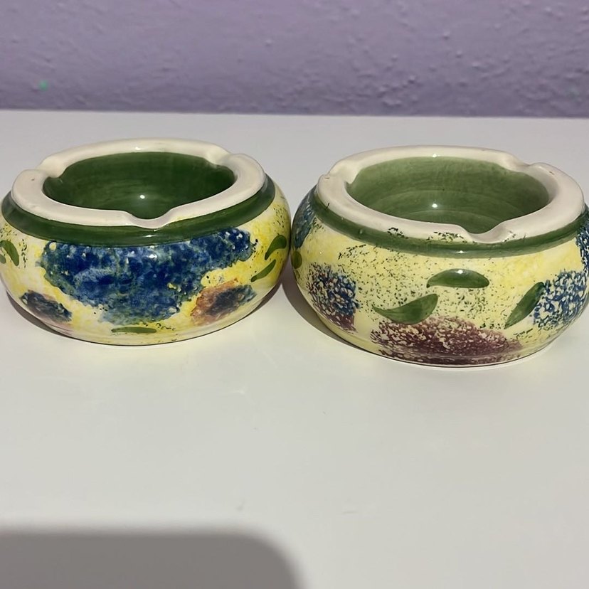 Yeşil iç yüzeyli, el boyaması çiçek desenli seramik küllük seti. Geleneksel el işi tarzında.