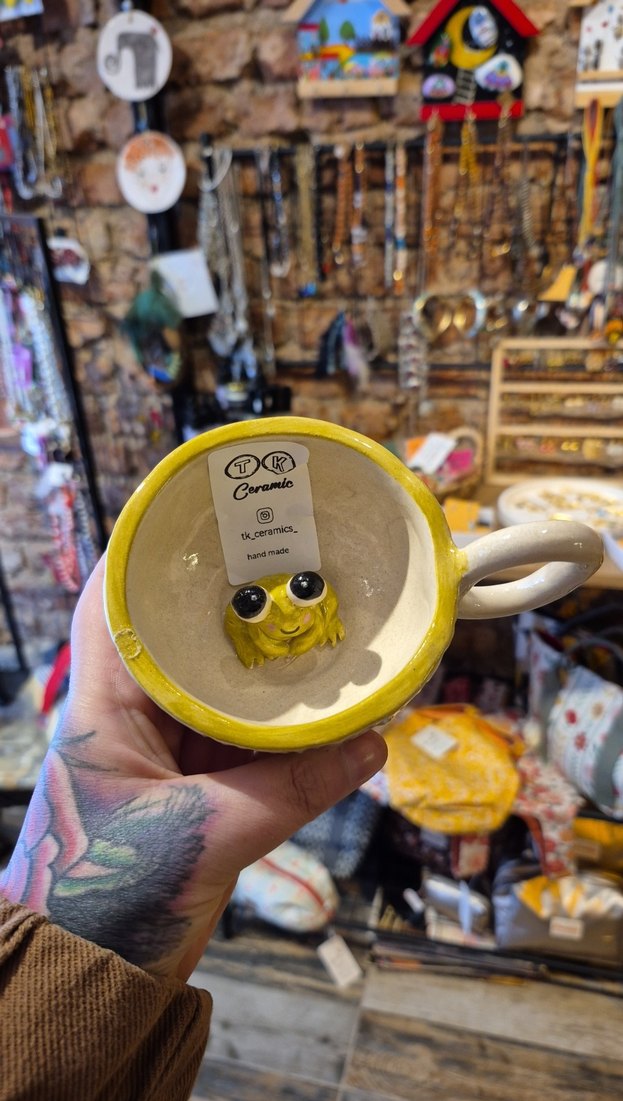 Renkli seramik el yapımı kupa, içinde sevimli bir figür barındırır. Keyifli bir içecek deneyimi sunar. ☕