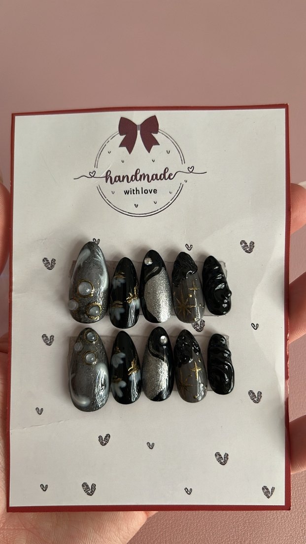 El yapımı, koyu siyah tırnak süsleri; parlak, dokulu ve metalik detayla süslenmiş.
