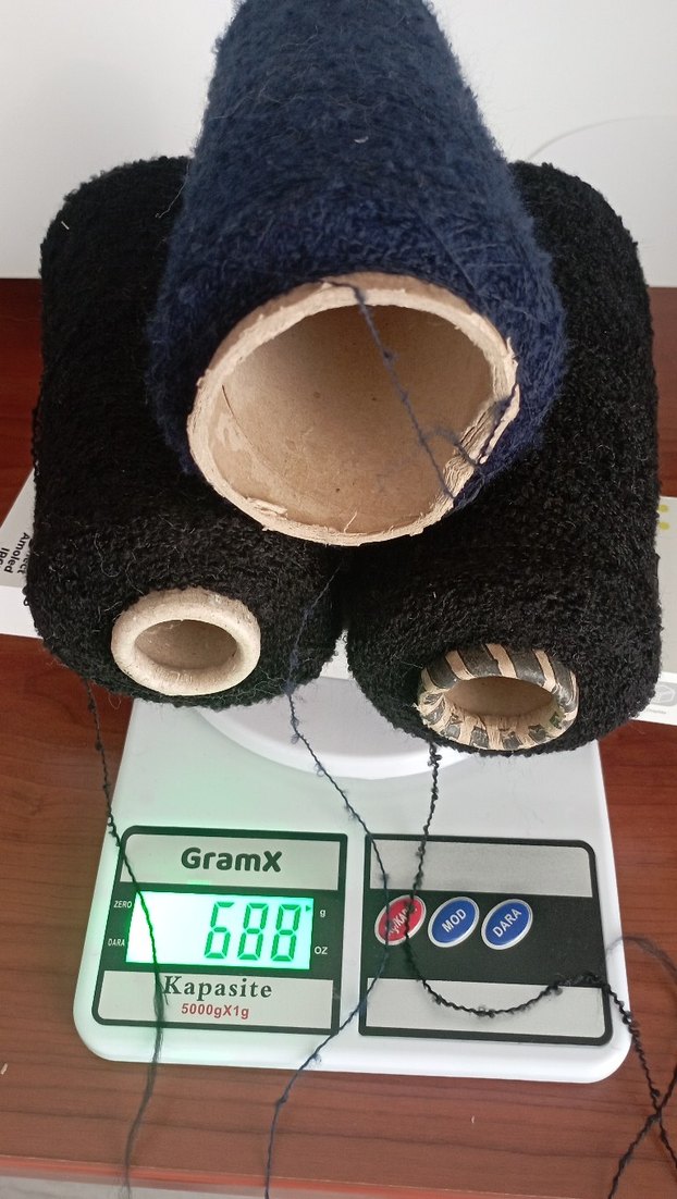 Siyah ve lacivert ince buklet iplik makara seti, dijital terazide 688 gram olarak ölçülmüştür.