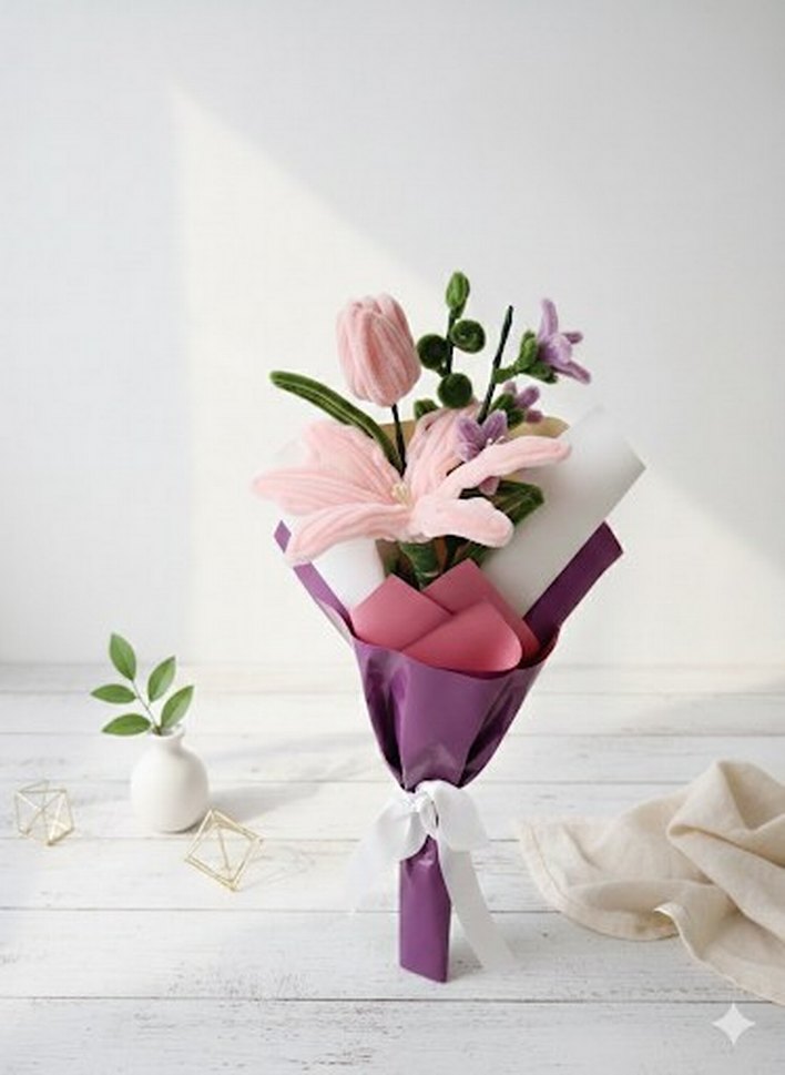 El Yapımı Pembe Şönil Çiçek Buketi (Açıklamayı okuyunuz)