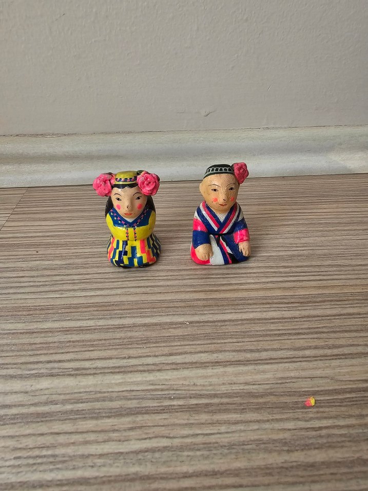 Vintage Özbekistan Halk Sanatı El Boyama Minyatür Çift Biblo. Özbek - Uygur kültürüne ait geleneksel çift figürü bereket, aile, evlilik ve uyum sembolizmini temsil eder, eve uyum ve huzur getirmesi ve evlilikte denge ile sadakati sembolize eder. Orta Asya / Özbekistan kökenli, el boyaması geleneksel çift biblolar, 1970–1990 dönemine tarihlenmektedir. Özbek/Uygur halk kültüründe aile birliği, bereket ve evlilik uyumunu temsil eder. Aile – bereket – uyum sembolü, koleksiyonluk ve aynı zamanda enerjetik obje.