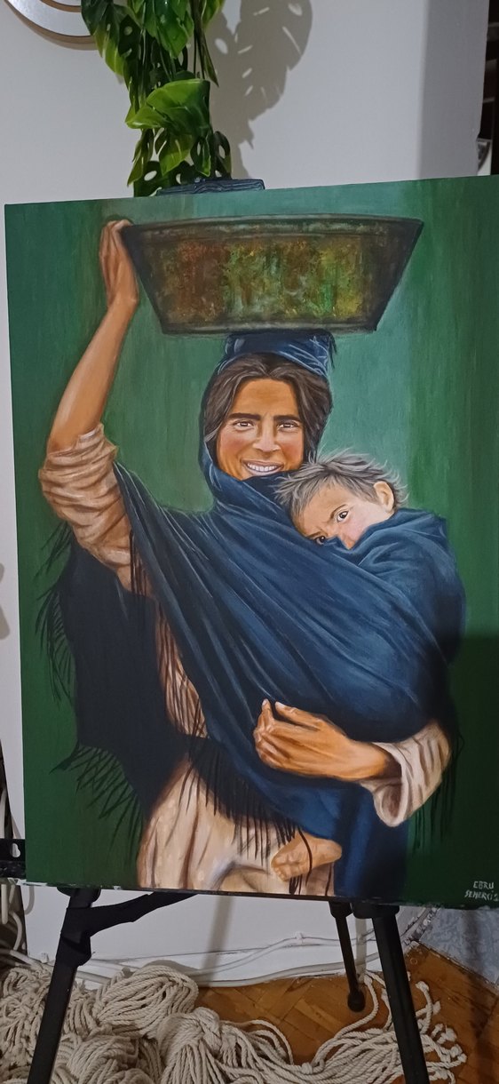 Bu tablo, başında sepet taşıyan ve koyu mavi kumaşa sarılı bir çocuğu kucaklayan gülümseyen bir kadını tasvir ediyor. Arka plan koyu yeşil tonlarda, sıcak ve samimi bir sahne oluşturuyor. 35×50 tuval üzerine akrilik boya çalışmam. Meşhur Afgan kizi fotoğrafının da sahibi olan Steve mcCurry nin anne ve cocuk adlı fotoğrafından esinlenerek yapılmıştır. Fotograf 1982 yılında Pakistanda çekilmiştir.