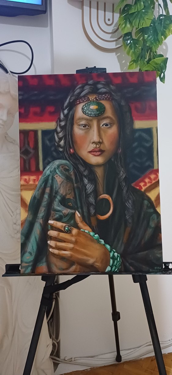 Bu tabloda turkuaz takılarla süslenmiş kadın, koyu ve zengin bir arka plan önünde betimlenmiştir. Örgülü saçları ve geleneksel kıyafeti dikkat çeker. 35×50 tuval üzerine akrilik boya çalışmam. orijinaldir. tibetli kadin resmedilmistir.
