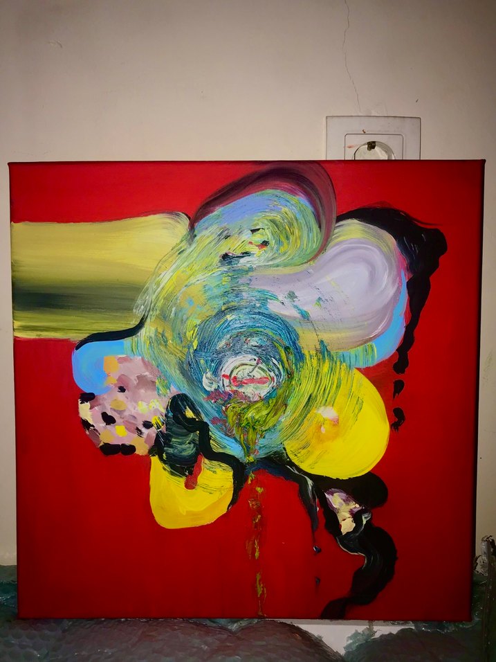 Akrilik ve yağlı boya ile tuval üzerine yapıldı ert sanat atölyesi tarafından hediye edilmeye uygun şekilde paketlenir 40x40 cm boyutunda Canlı renklerle kırmızı zemin üzerine yapılmış soyut bir tablo, dinamik fırça darbeleri ve çeşitli şekiller içerir.