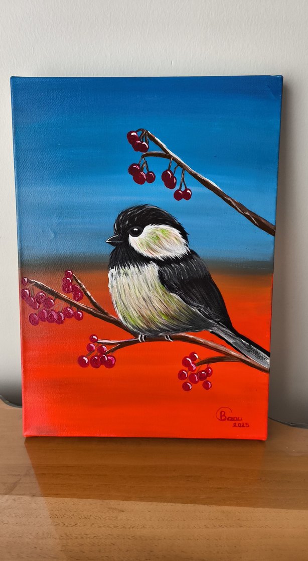 25 x35 cm el.yapimi imzalı tablo.Bu tabloda siyah beyaz bir kuş, kırmızı meyveli dallar üzerinde, canlı mavi ve turuncu arka plan önünde yer alıyor.