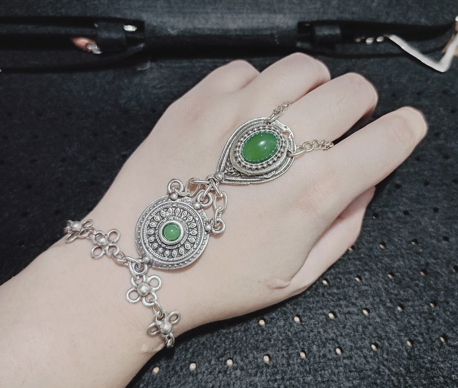 Turkuaz taşlar ve detaylı zincir işçiliğiyle bohem tarzda, renkli ve nakış desenli el aksesuarı. Günlük kullanıma uygun. ✨